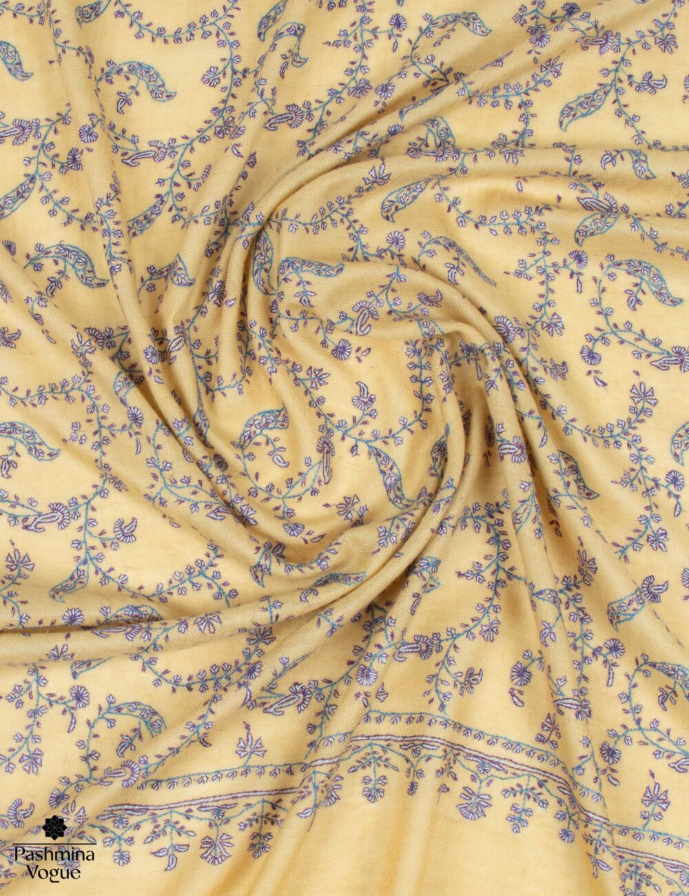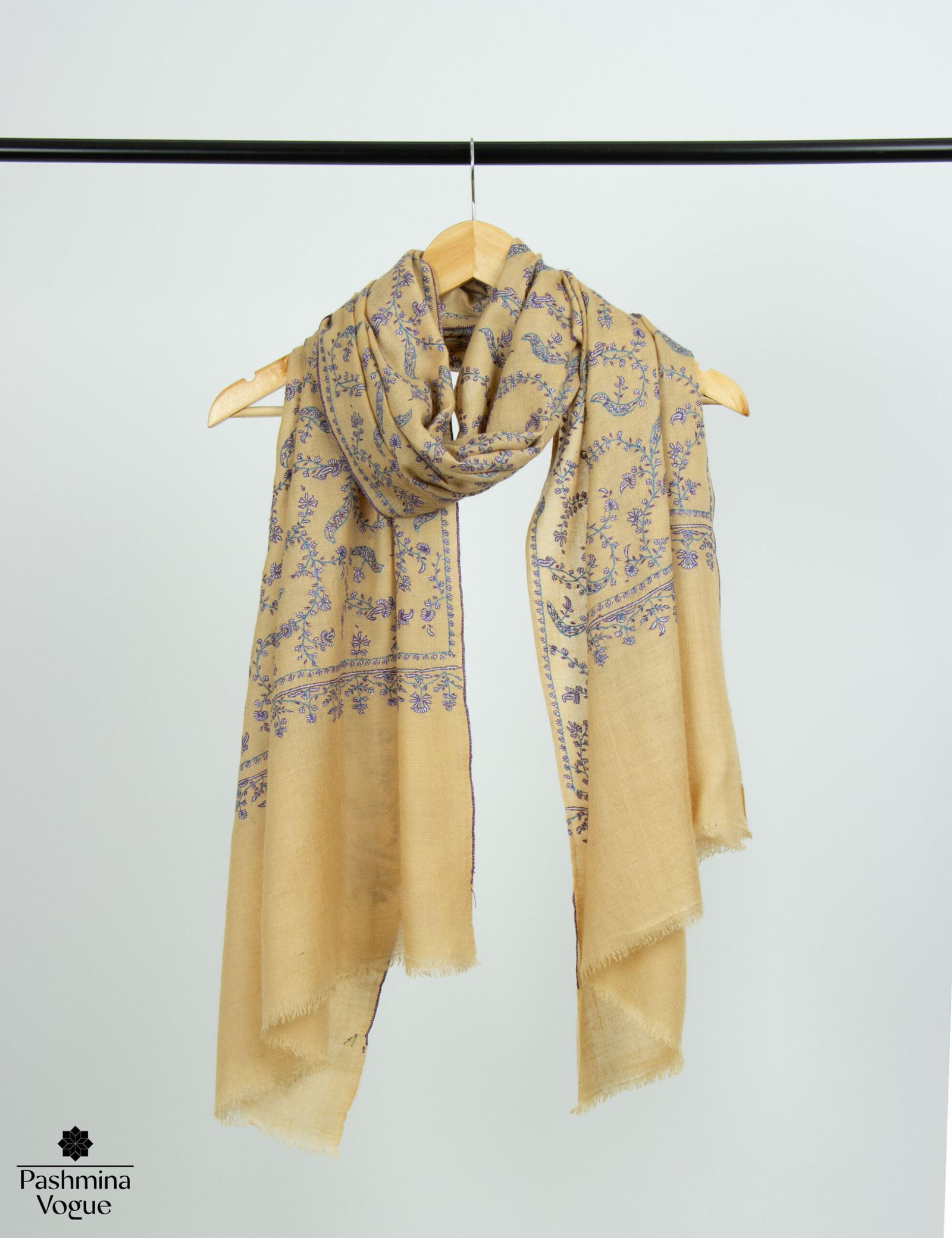 Its rich brandy tone and intricate jaal pattern reflect balance and beauty. In earlier times, kings commissioned such shawls, made from hand-gathered pashmina wool from the highlands of Ladakh. Later, artisans added fine embroidery, enhancing the regal feel.