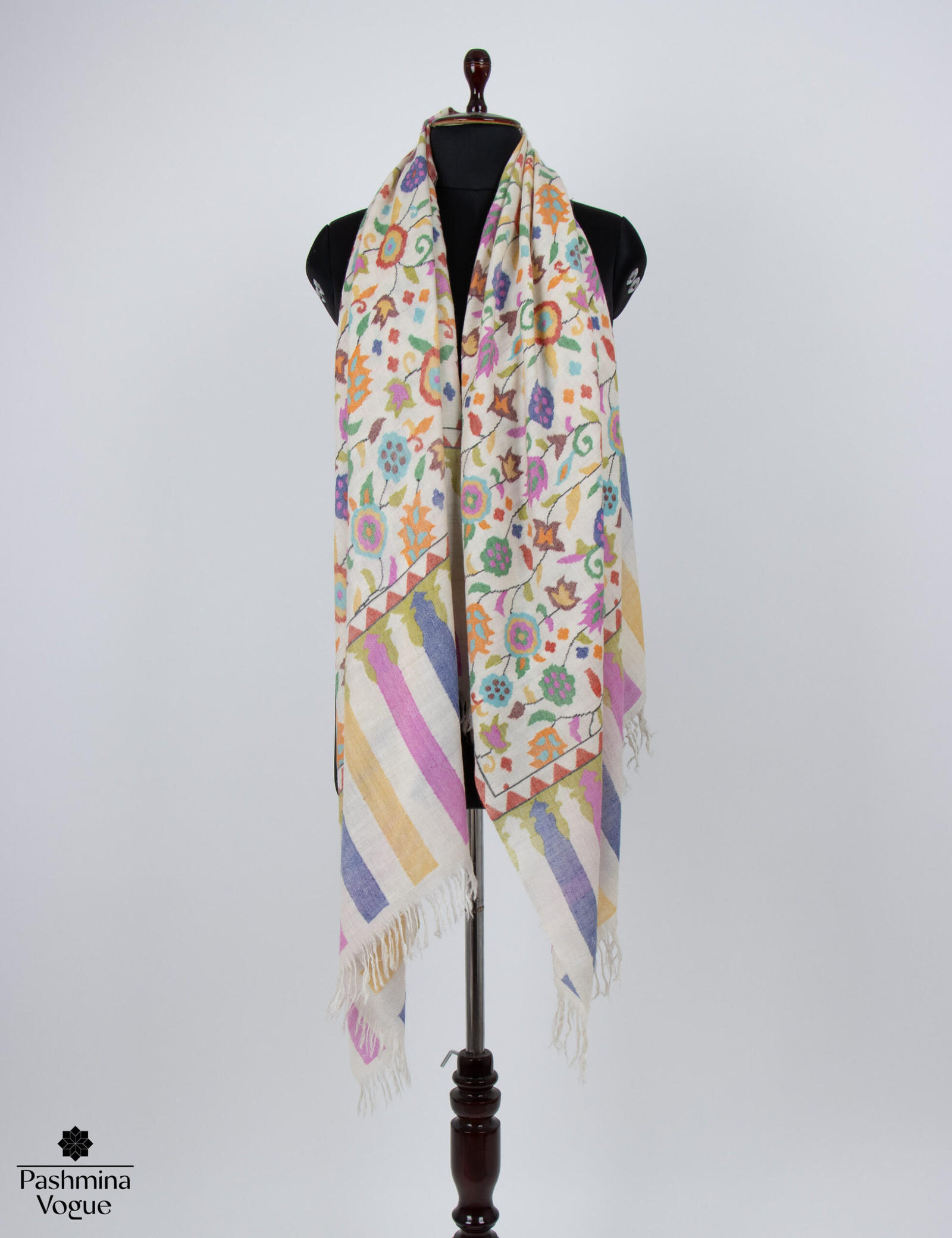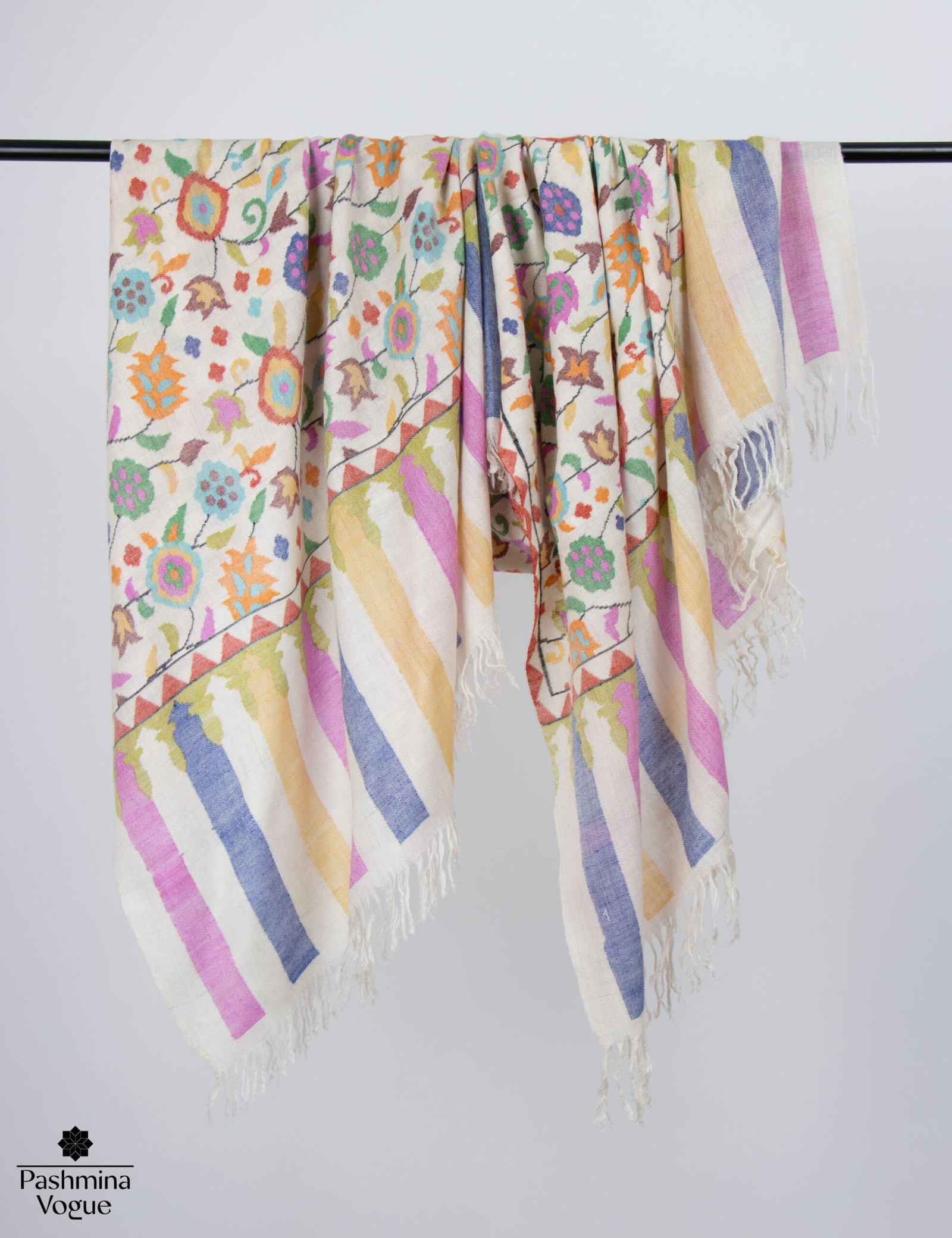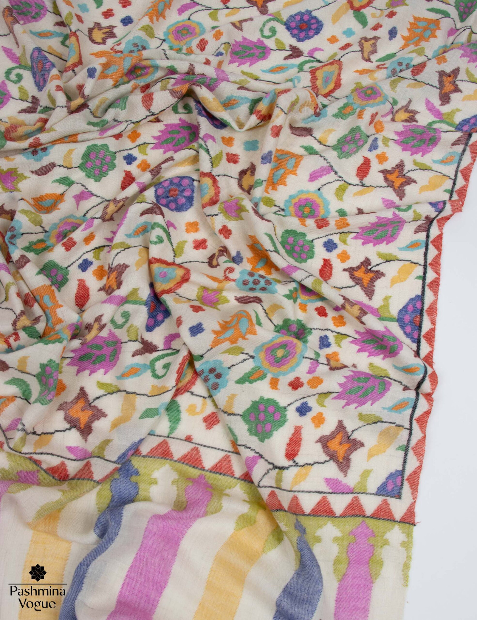 The Celestial Colors Pashmina Kani Jamavar Shawl embodies timeless elegance, designed for connoisseurs of fine craftsmanship. Handwoven in serene ivory, this shawl features a delicate, feather-light Cashmere base. Skilled artisans bring each Kani motif to life with intricate paisleys that seem to dance across the fabric, casting a spell of beauty and tradition. More than a luxury wrap, *Celestial Colors* carries a living legacy that bridges tradition with modernity. This shawl is a rare treasure for those who truly value the art of fine weaving.