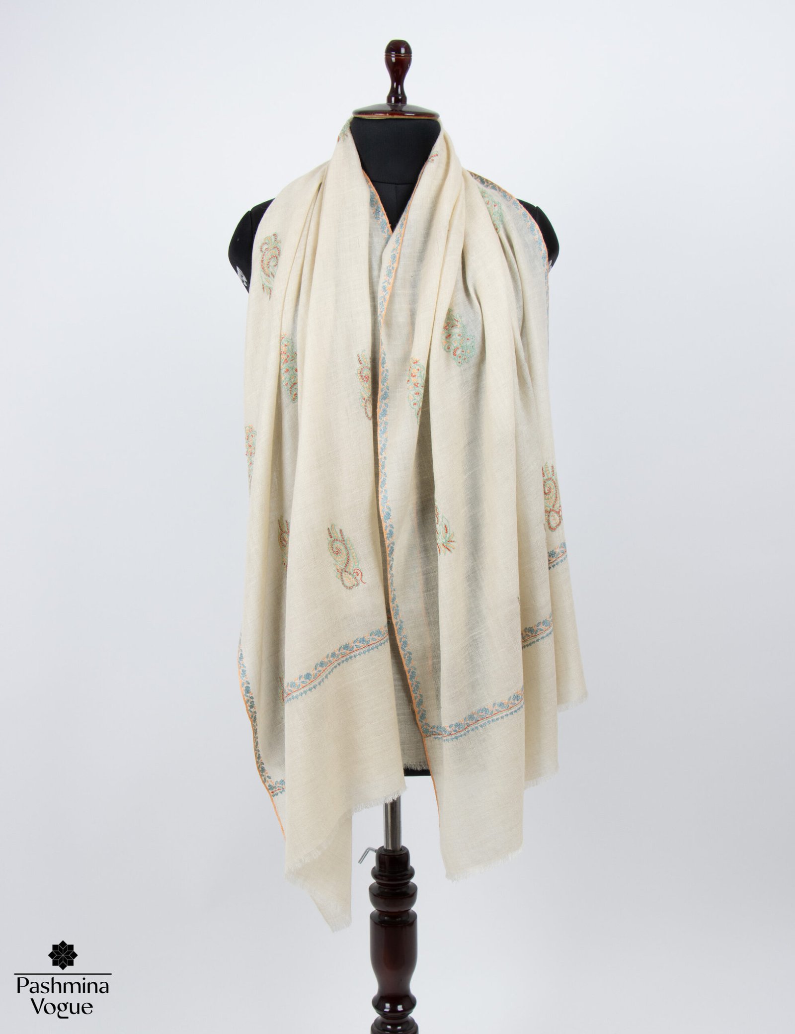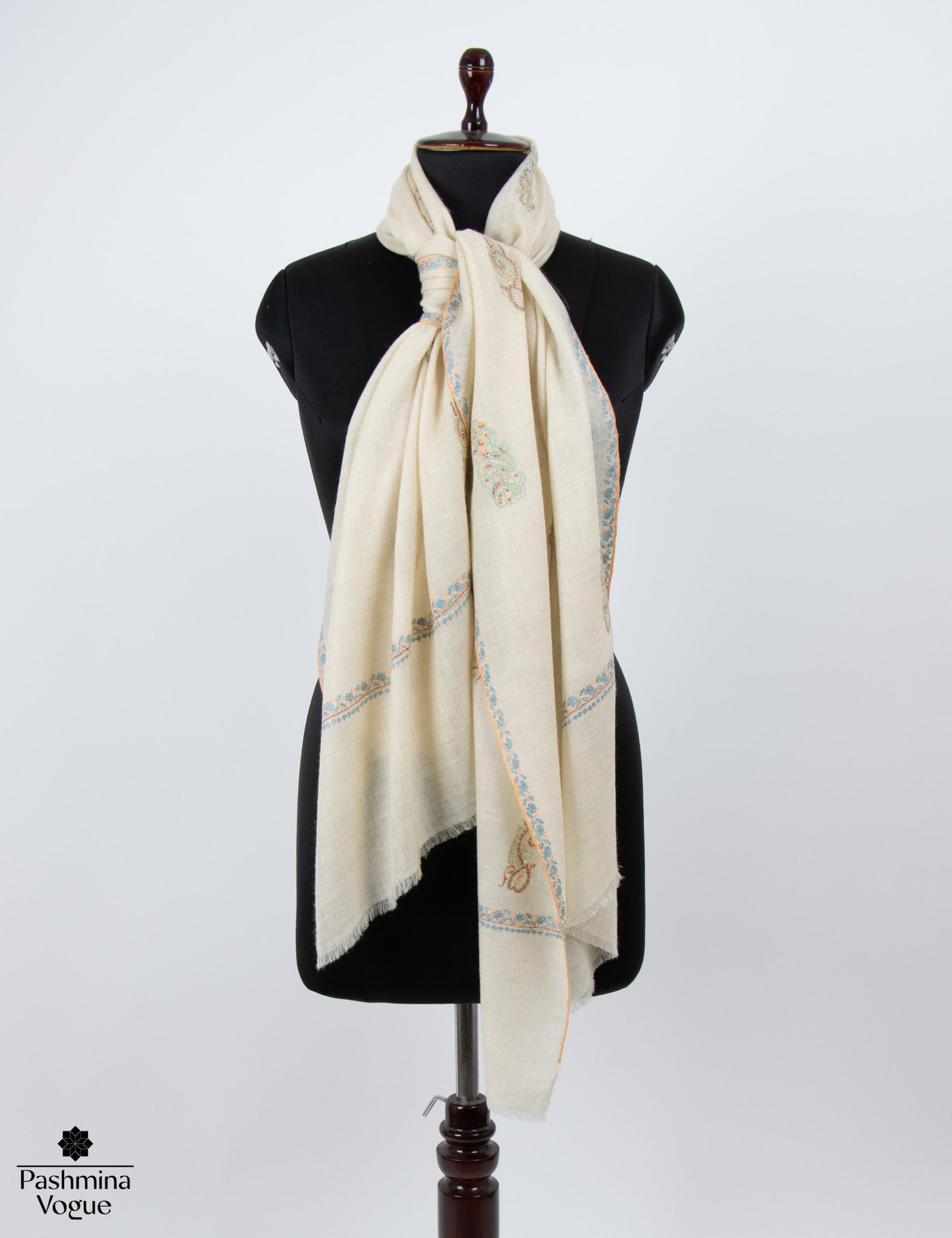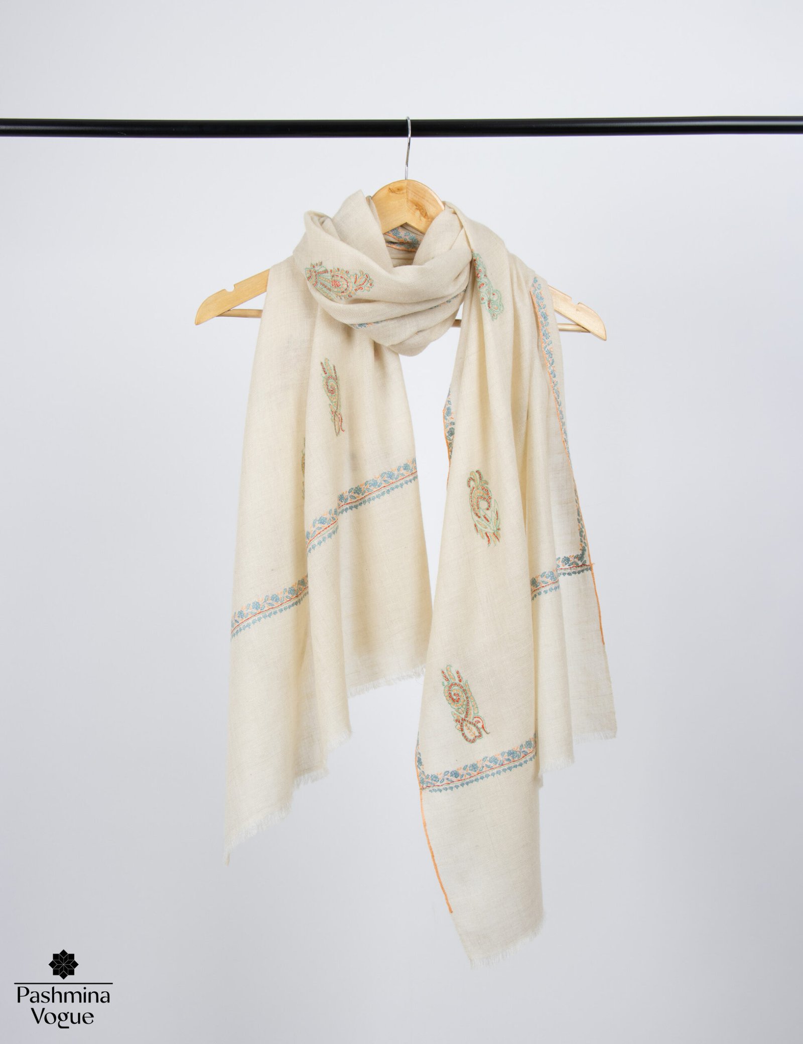 Embrace the purity of Himalayan craftsmanship with our Natural White Hand-Embroidered Pashmina Scarf. This ivory Kashmir Sozni wrap is hand-loomed from 100% pure pashmina, the finest cashmere wool harvested from the high-altitude Changthangi goat. Because the wool is kept in its natural, undyed state, the scarf retains an exceptional buttery softness and organic luster that is incredibly gentle against the skin.