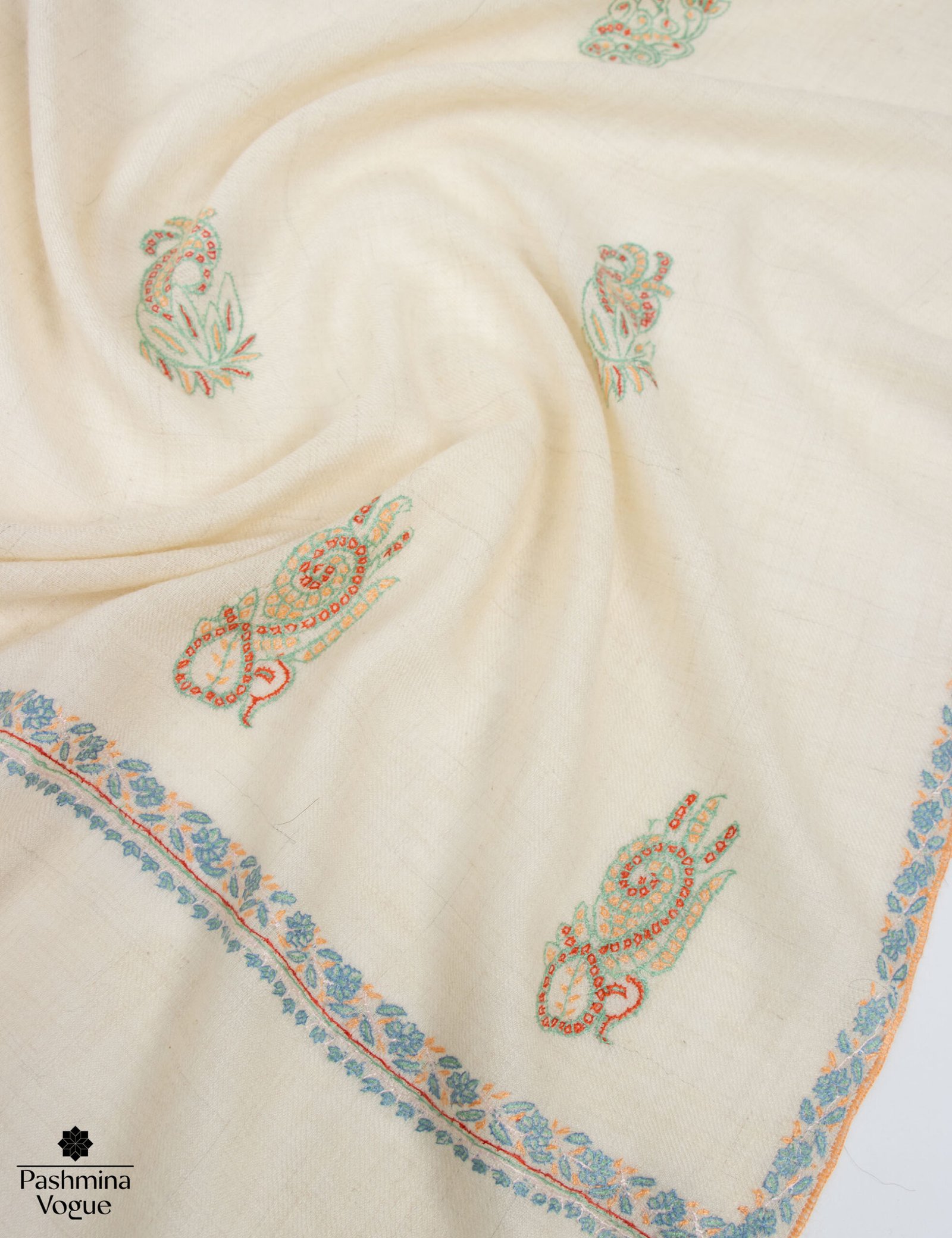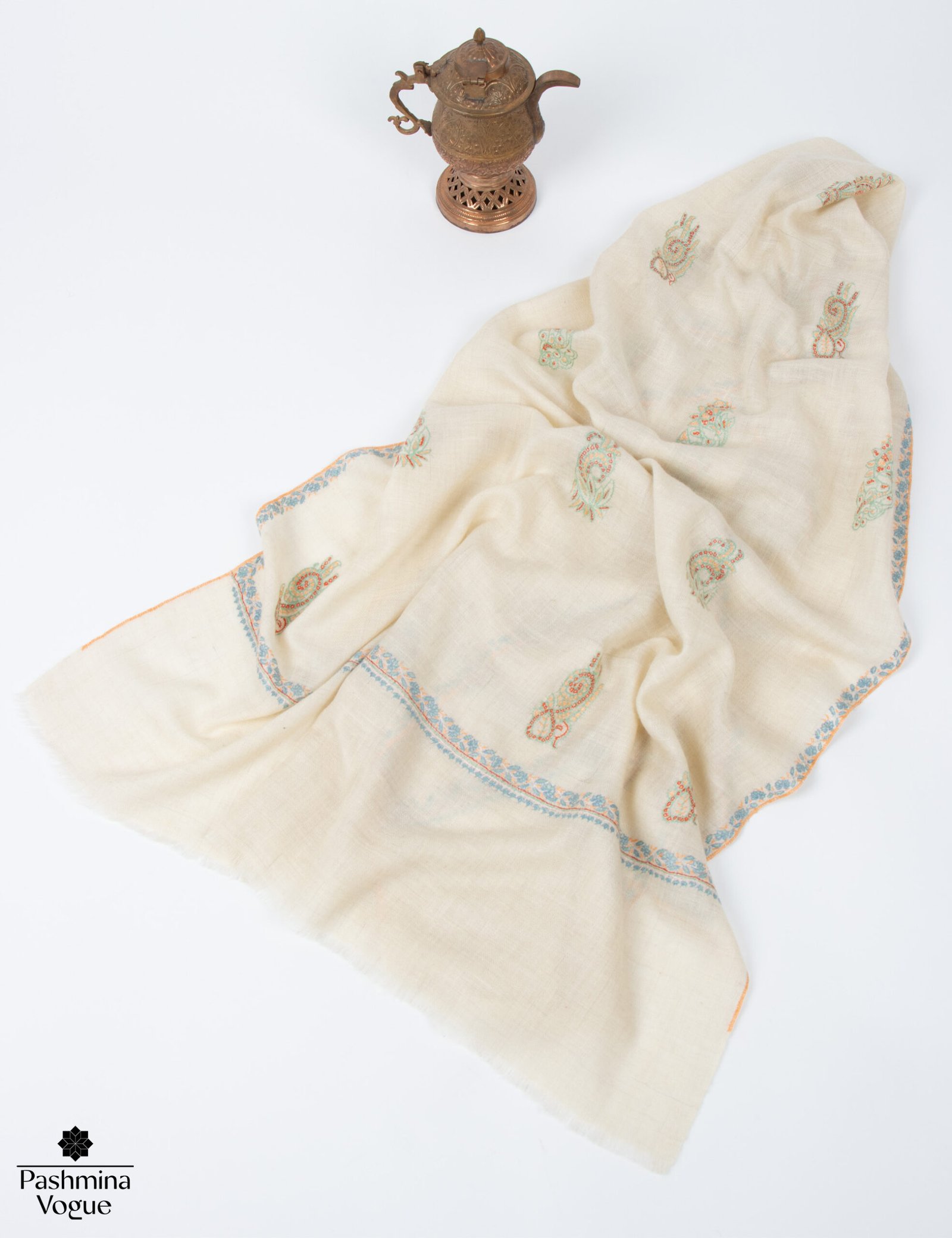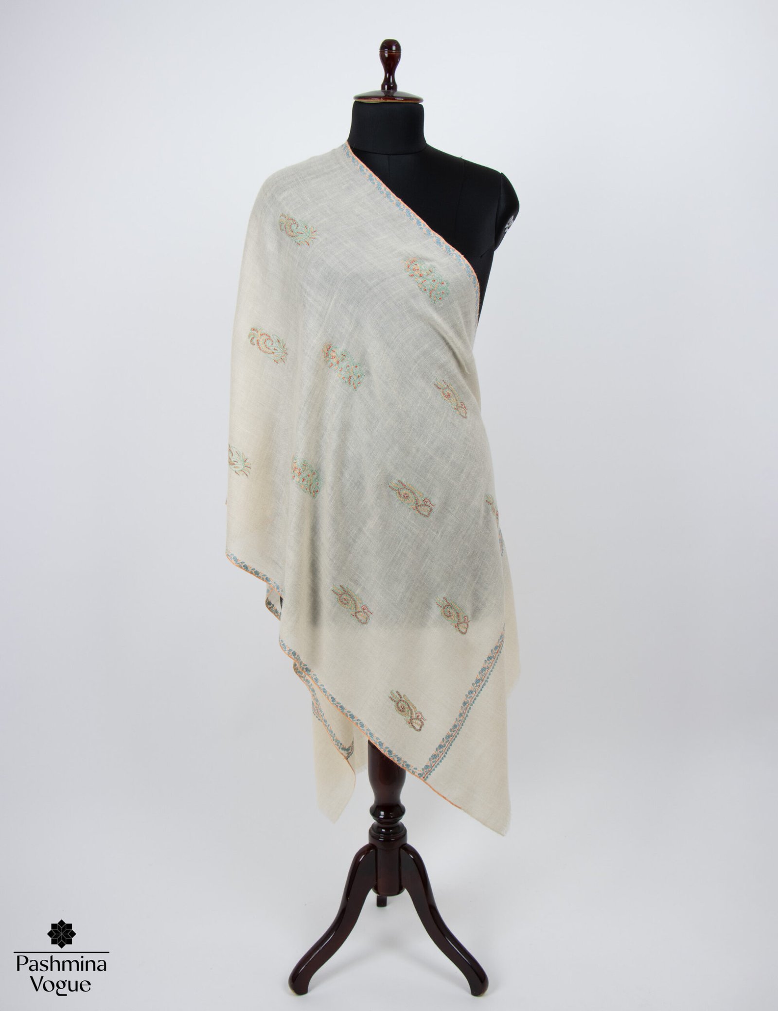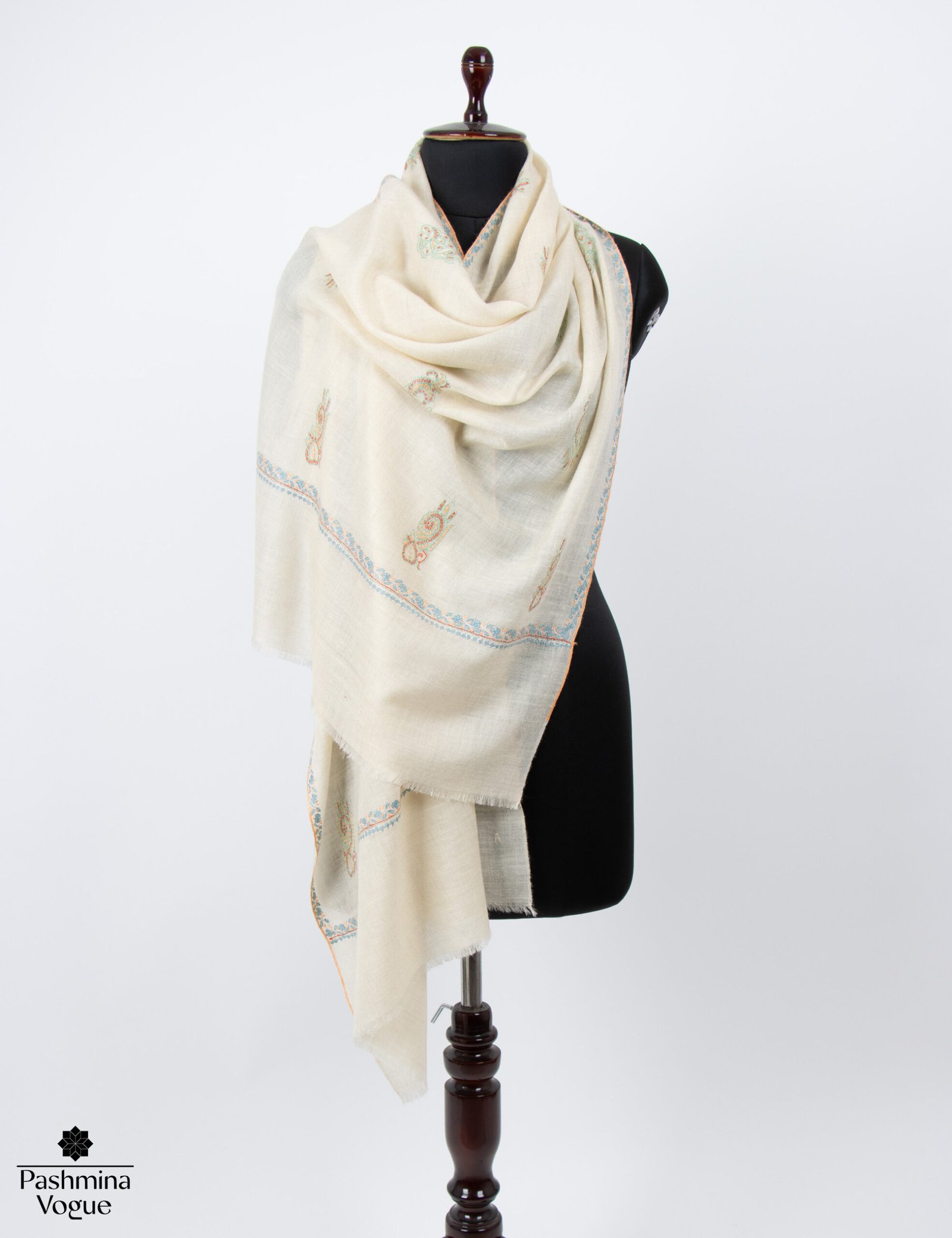 Embrace the purity of Himalayan craftsmanship with our Natural White Hand-Embroidered Pashmina Scarf. This ivory Kashmir Sozni wrap is hand-loomed from 100% pure pashmina, the finest cashmere wool harvested from the high-altitude Changthangi goat. Because the wool is kept in its natural, undyed state, the scarf retains an exceptional buttery softness and organic luster that is incredibly gentle against the skin.